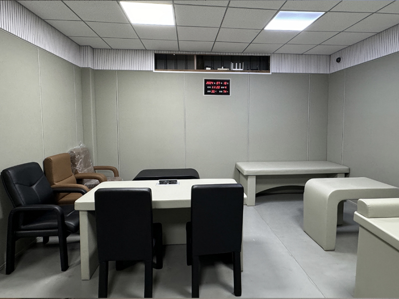 审讯室是全方位的信息交流,除了直接的言语和体语交流之外,房间墙面的装修、家具的颜色、录像、画像的摆挂、阳光的投射灯,都可以传达着无声的信息。同时也会留着隐患,应该全方位软化处理,审讯室墙面装修阻燃软包软化材料,可以降低意外事件发生。