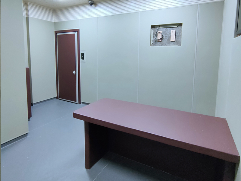 审讯室是全方位的信息交流,除了直接的言语和体语交流之外,房间墙面的装修、家具的颜色、录像、画像的摆挂、阳光的投射灯,都可以传达着无声的信息。同时也会留着隐患,应该全方位软化处理,审讯室墙面装修阻燃软包软化材料,可以降低意外事件发生。